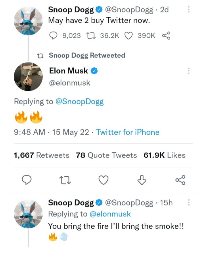 Snoop Dogg responded to Musk's response by saying, "You bring the fire, I'll provide the smoke."