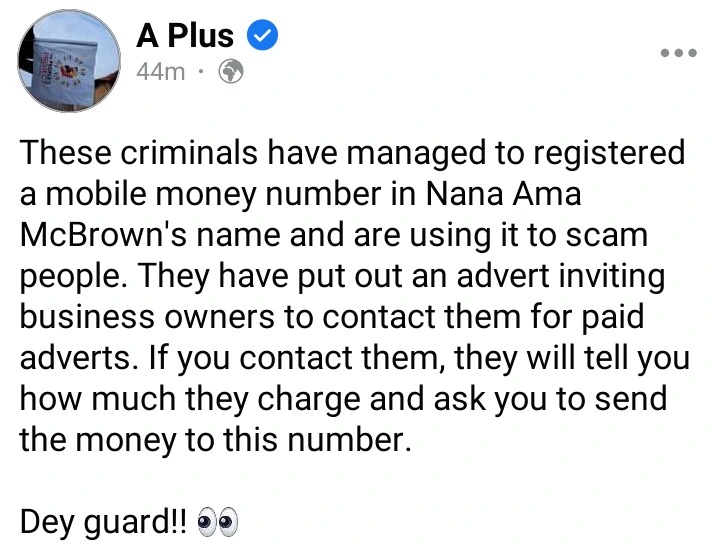 "These con artists have registered a mobile money number in Nana Ama McBrown's name and are using it to defraud people. They've placed an ad in the paper requesting company owners to contact them about sponsored advertisements. They will tell you how much they charge and urge you to pay the money to this number if you call them."