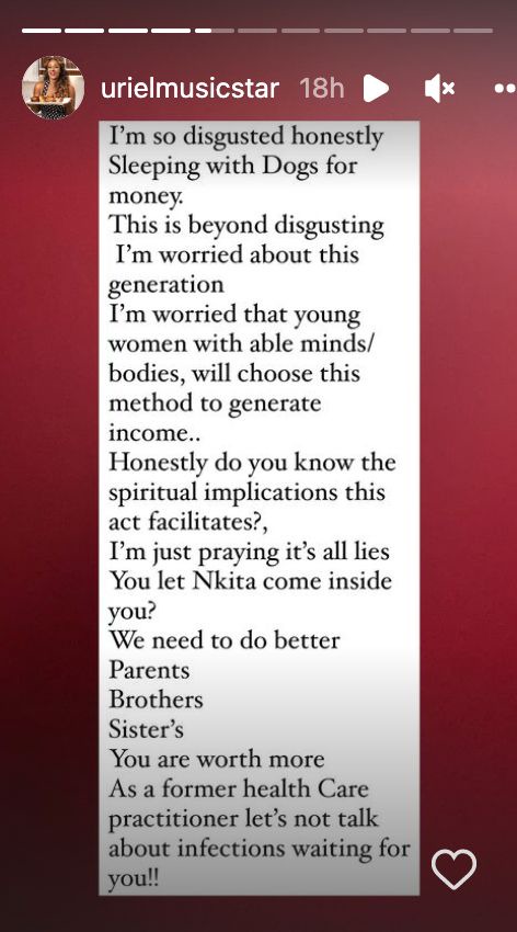 Uriel Oputa, the actress of the popular Big Brother Naija reality television game show, has expressed her displeasure with viral footage of women engaging in sexual acts with dogs for money.